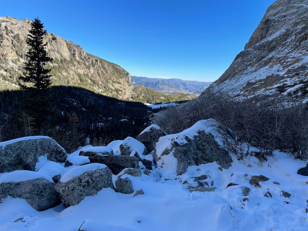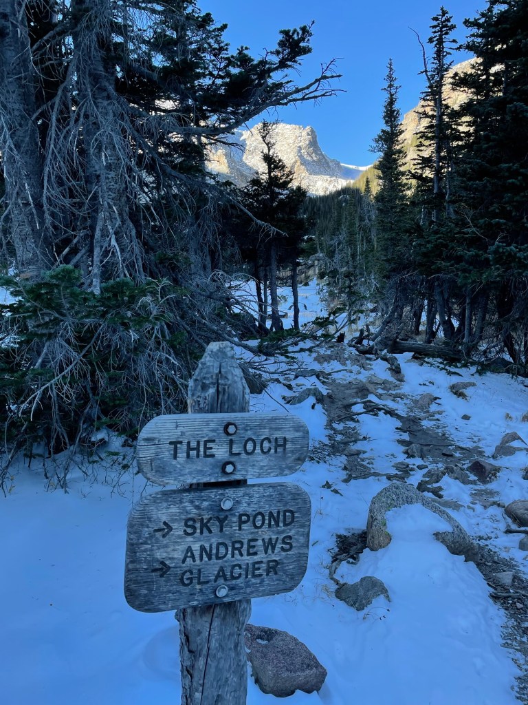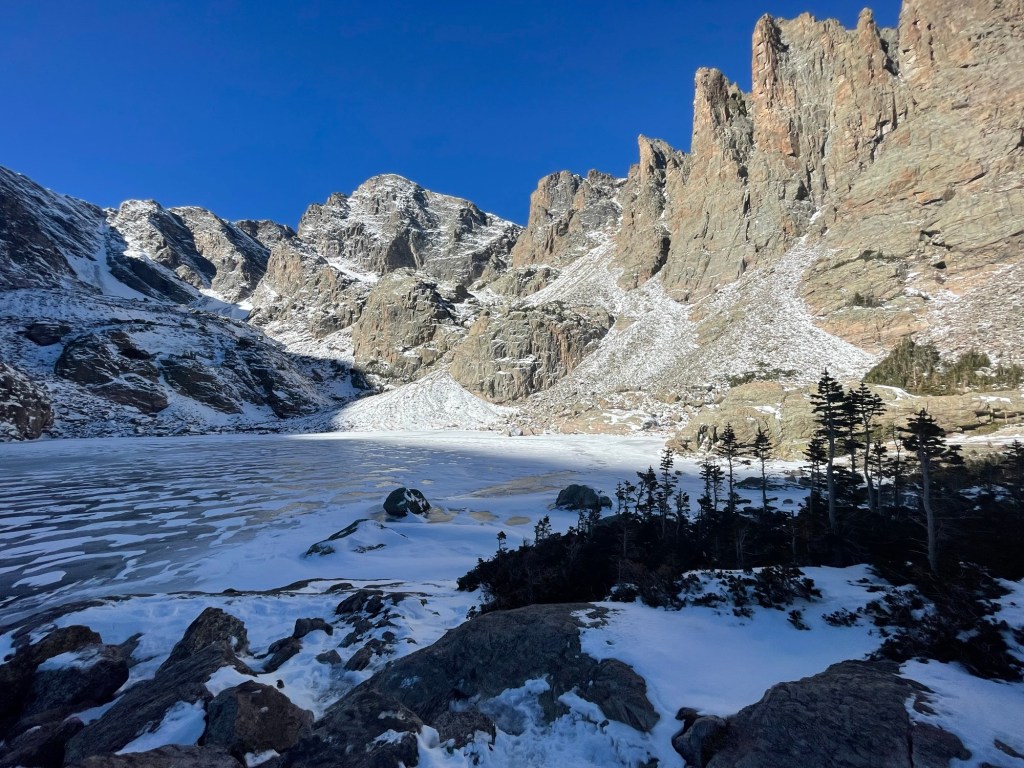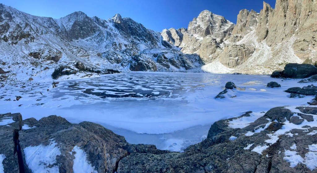 This was a really fun hike that I did in October 2022. When I did it, there was plenty of snow and ice on the ground, not enough to need snowshoes, but enough to need microspikes. The hike gets steeper past The Loch, and the crux of the route is a rocky waterfall you need to climb, made more difficult in the winter when it is iced over. I didn’t have an ice axe, and ended up slipping and falling 10 ft onto the snow below. I found an alternate line and made it up on my second attempt. It was well worth it! Sky Pond frozen over was a sight to see, and I had it to myself for a little bit.